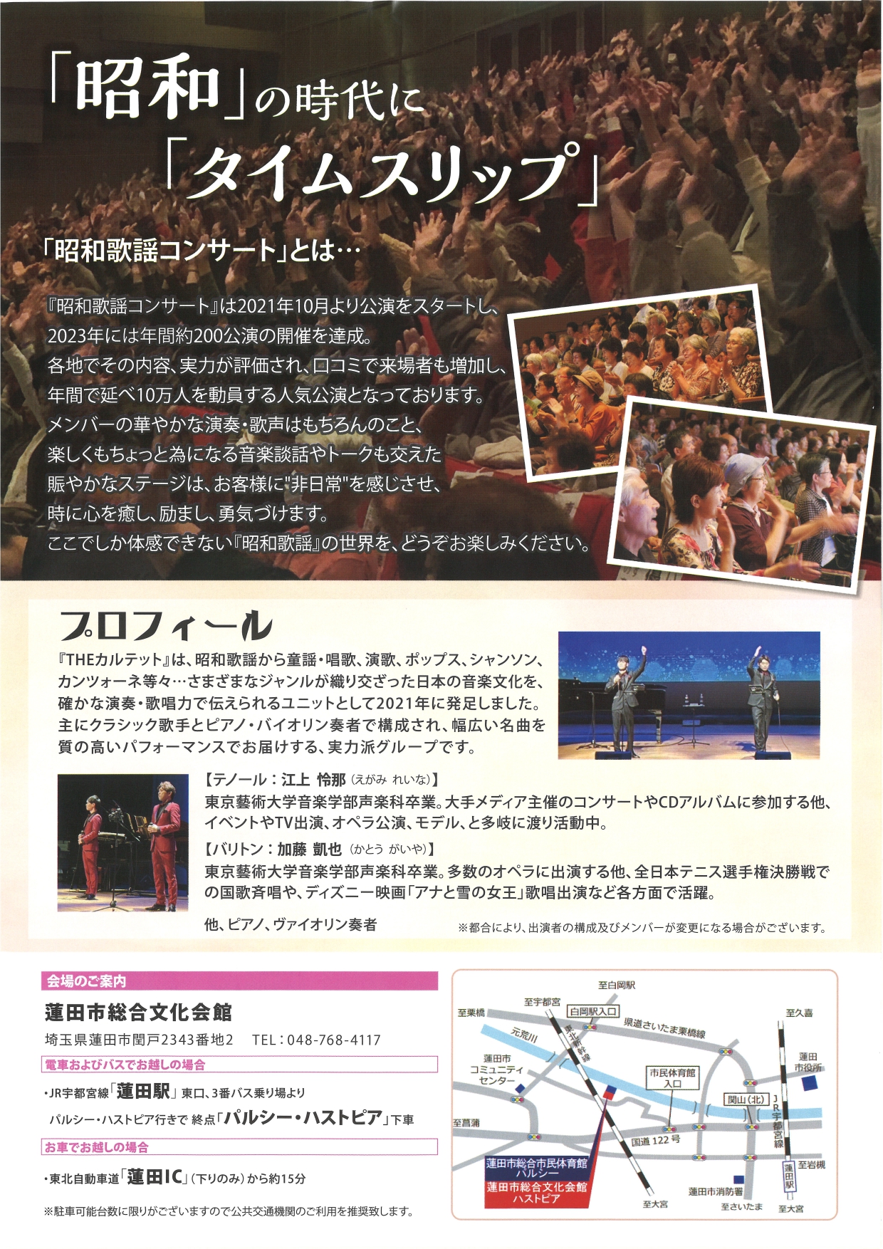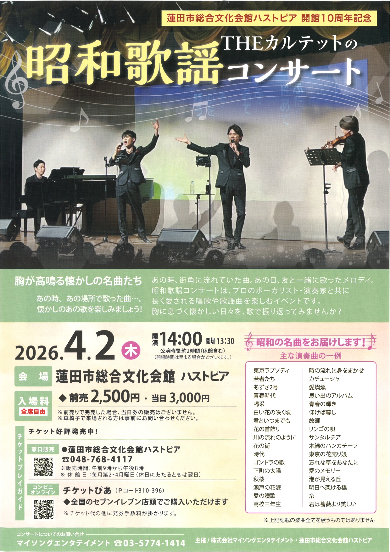 あの時、あの場所で歌った曲・・・あの人と一緒に聞いた曲・・昭和の懐かしの名曲を、プロのボーカリスト・演奏家と共にお送りします。ぜひ、ハストピアで素晴らしい演奏と歌声を楽しんでください。